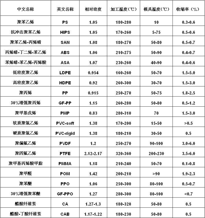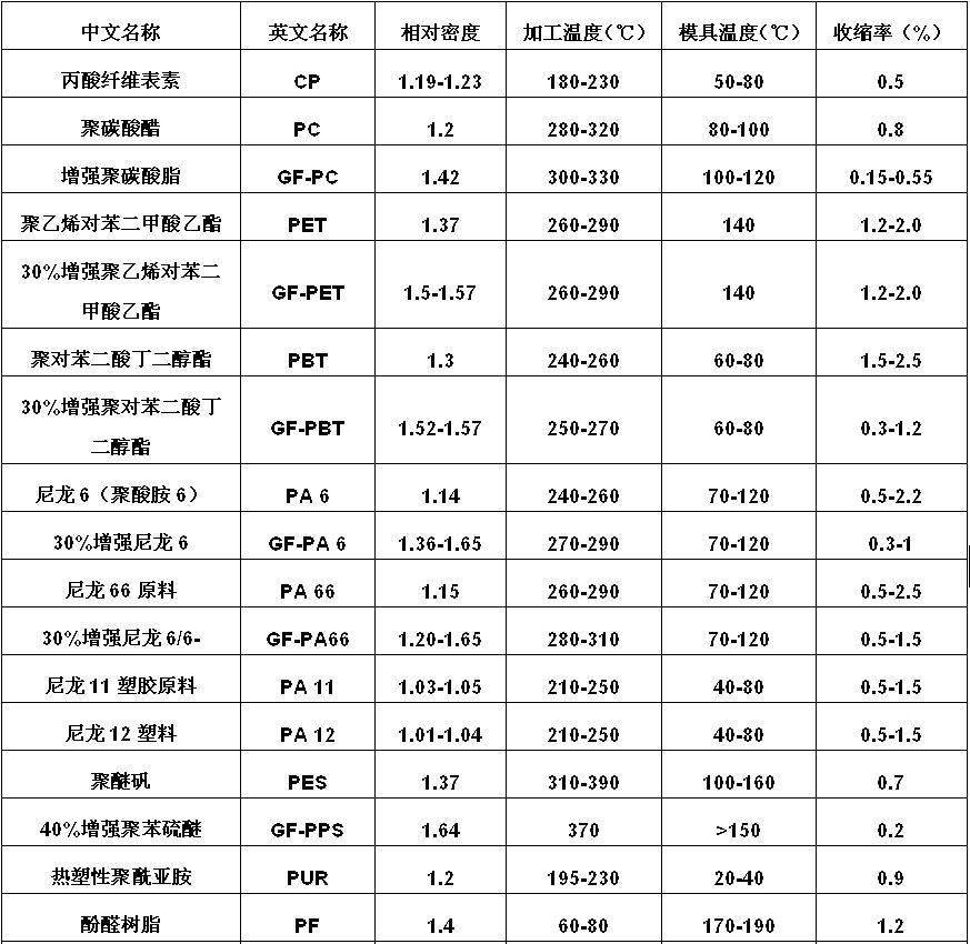 從表1中可以看出,熱塑性能塑料以40%增強(qiáng)的PPS收縮率最低,熱固性塑料以環(huán)氧樹脂的收縮率最低,兩種塑料的收縮率都為0.2%。收縮率最大的為氟類塑料,最高可以達(dá)到6%左右;收縮率次大的為低密度聚乙烯,收縮率最大達(dá)到5%。