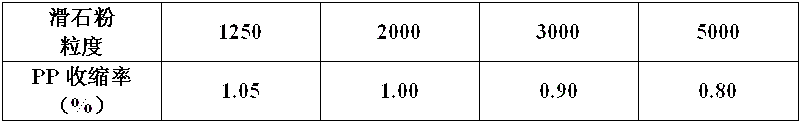 同一種填料的粒度不同,對(duì)收縮率的影響效果也不同,粒度越小對(duì)收縮率的影響就越大。以滑石粉填充PP(20%滑石粉+8%POE)為例,不同粒度滑石粉對(duì)收縮率的影響見表5。