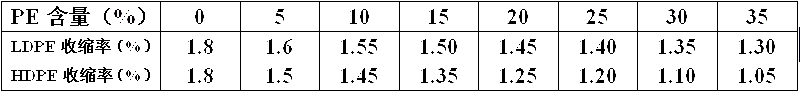 以在PP中加入PE樹脂為例,不同含量PE對(duì)PP收縮率的影響見表8。