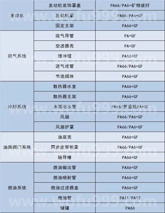 汽車很多部位都會主動或者被動的產生高溫,高耐熱性就很考驗改性塑料的重要一環。汽車機罩需求塑料除高剛性,高韌性外,增強耐熱性和流動性使用半芳香族尼龍(PA9T,聚對苯二甲酰1,9壬二胺)這些都是代表性耐熱尼龍。這方面代表產品,美國杜邦公司的高溫尼龍Zytel HTN在這方面也有很好的性能,具有高耐熱性且可替代PPS和熱固性樹脂,應用于汽動剎車系統,可節約成本和部件輕型化。另外Solvay推出的 PPA系列,能持續耐溫200℃,尺寸穩定性極高。還有瑞士EMS Grivory的 Grivory HT也在耐熱性表現良好。杜邦公司的半透明PA66 Zytel 牌號,可制作42V電子系統保險絲盒,成本較聚砜和聚醚砜便宜20%。Rhodia 公司開發用于冷卻水箱和冷卻、加熱回路的玻纖增強PA66 Technyl,能長期在130℃下使用,最高耐溫160℃。